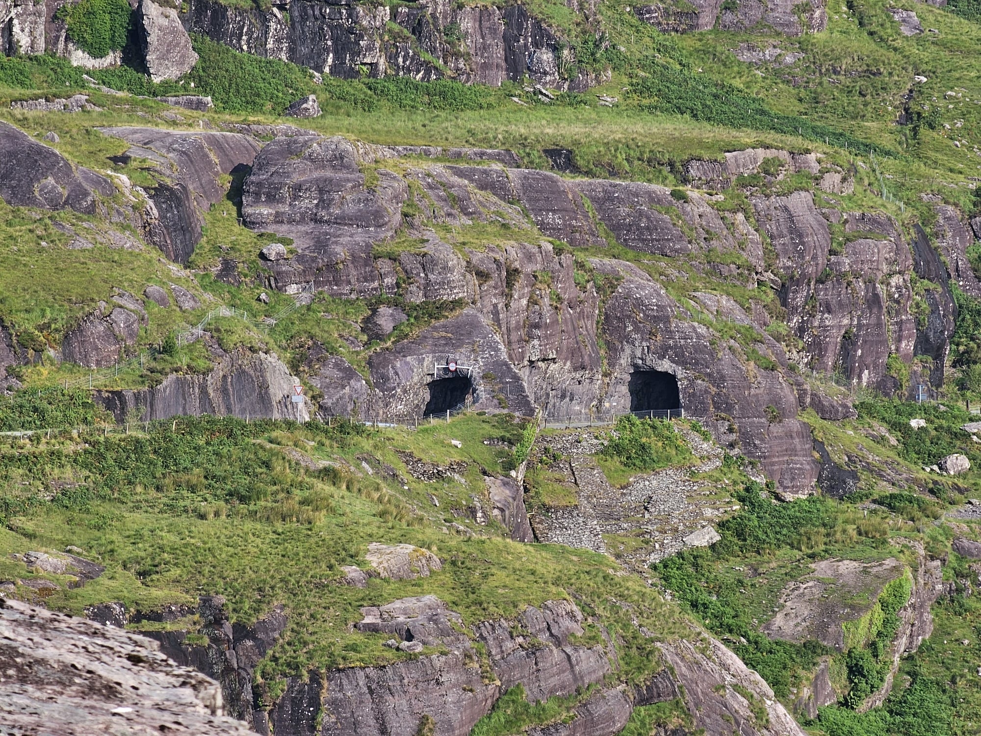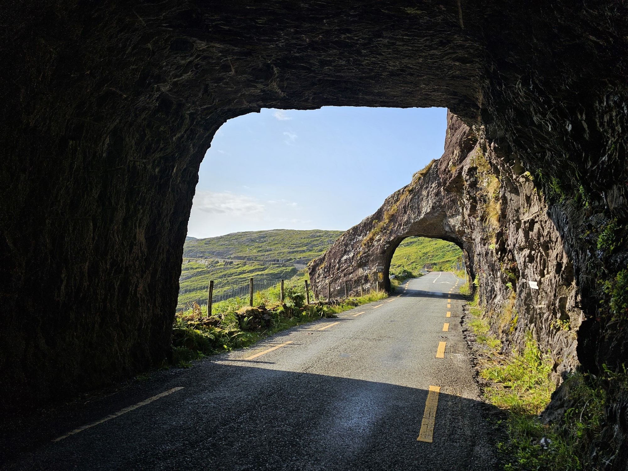 In the heart of Bonane, where the N71 secondary national road converges with the rugged Caha Mountain range, lies a hidden gem – the historic tunnels. This hand-cut marvel, stretching long and dramatic, serves as Bonane’s grand entrance from the Cork side. As if in harmony, three shorter tunnels follow, etched into the hillside.